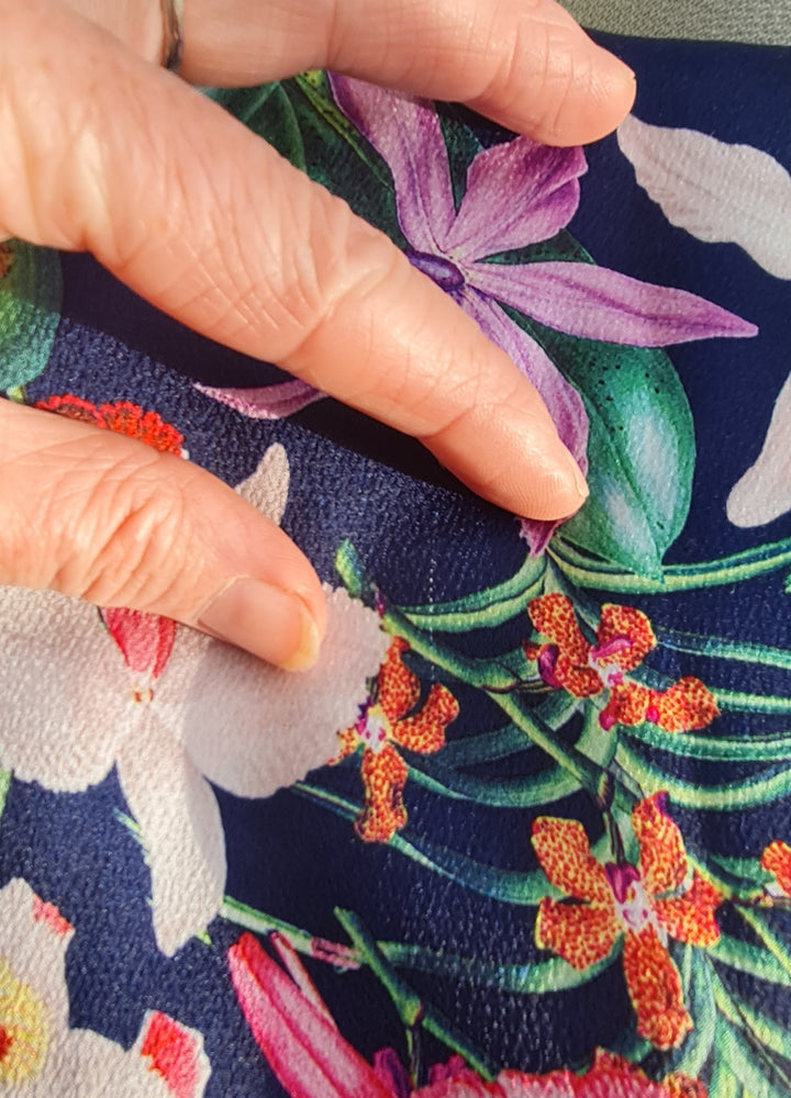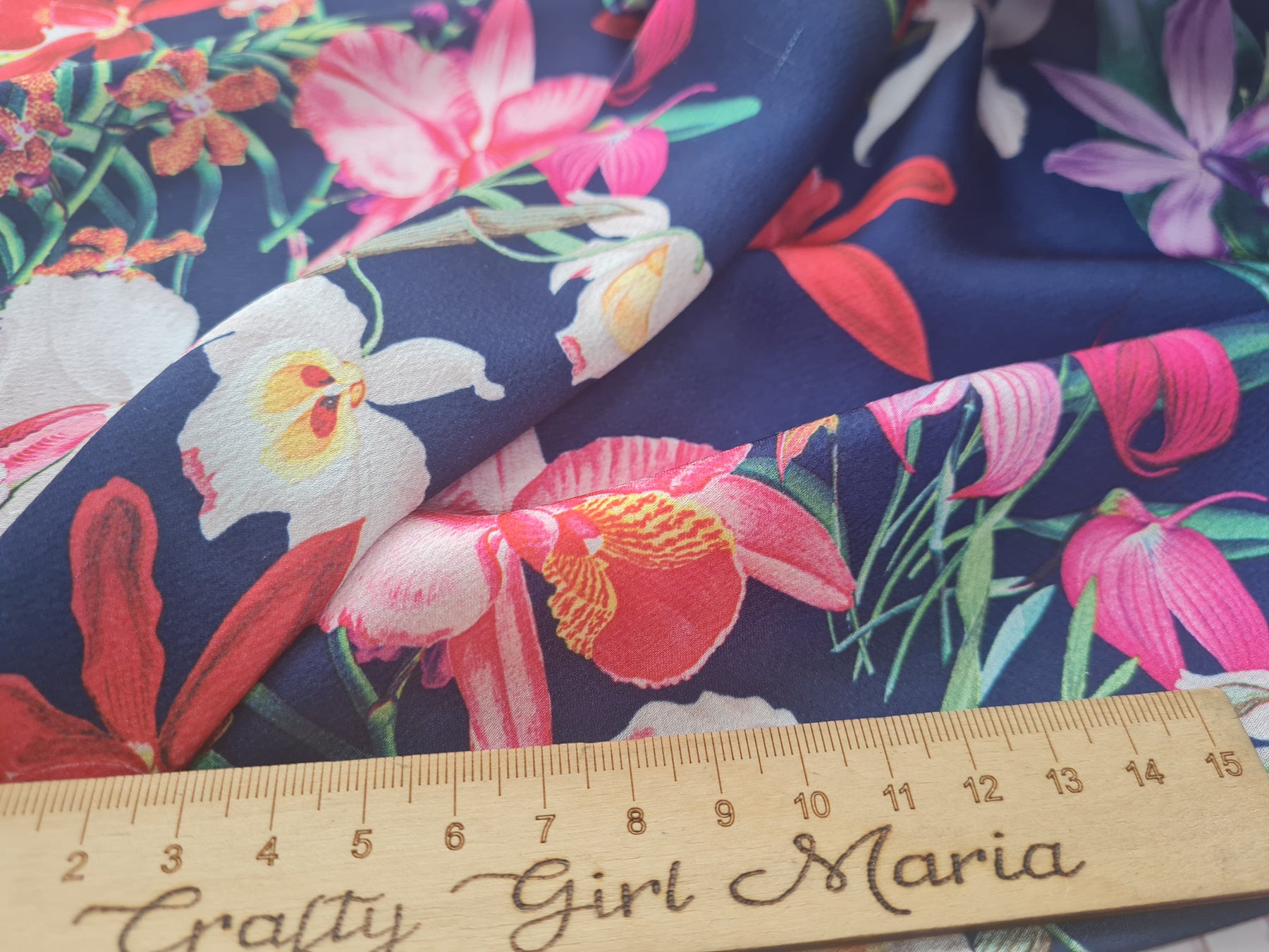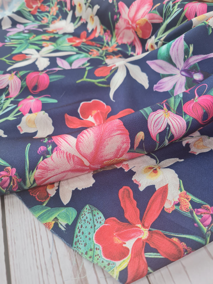 • Navy floral satin crepe - there is a small pull in the fabric in one place. 100% polyester.