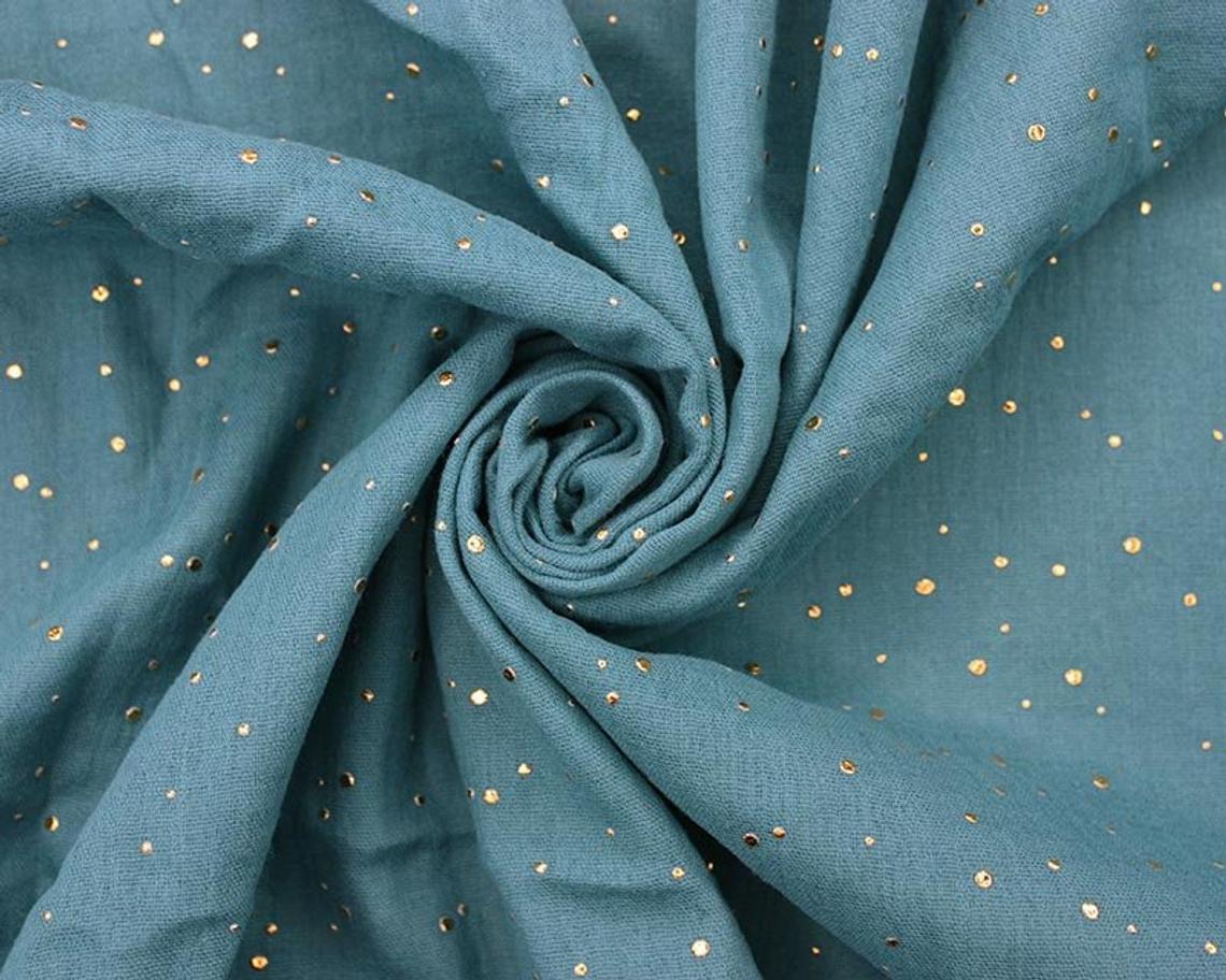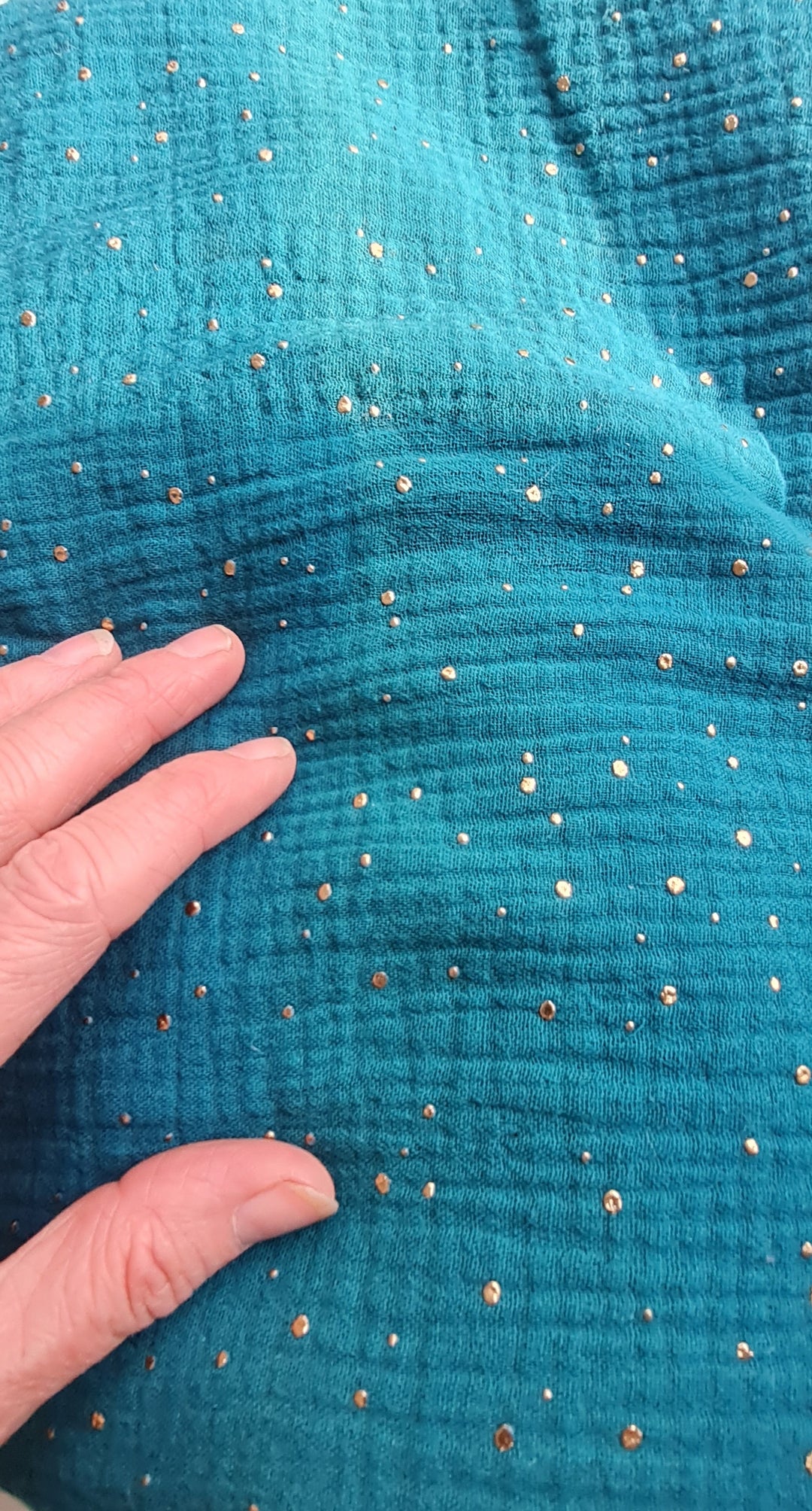 • Teal speckled double gauze - there is faint sun damage on various points. Roughly half the width is free of sun damage.  100% cotton.