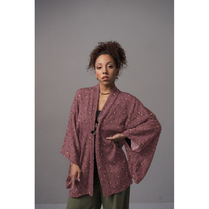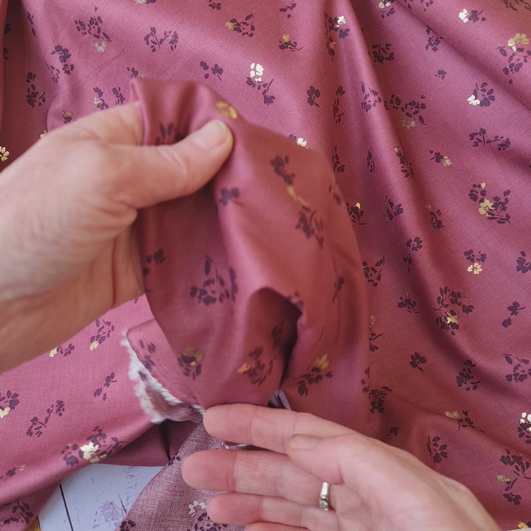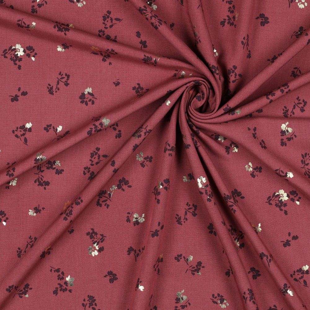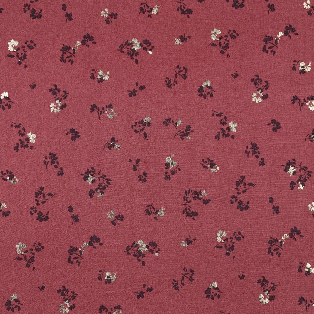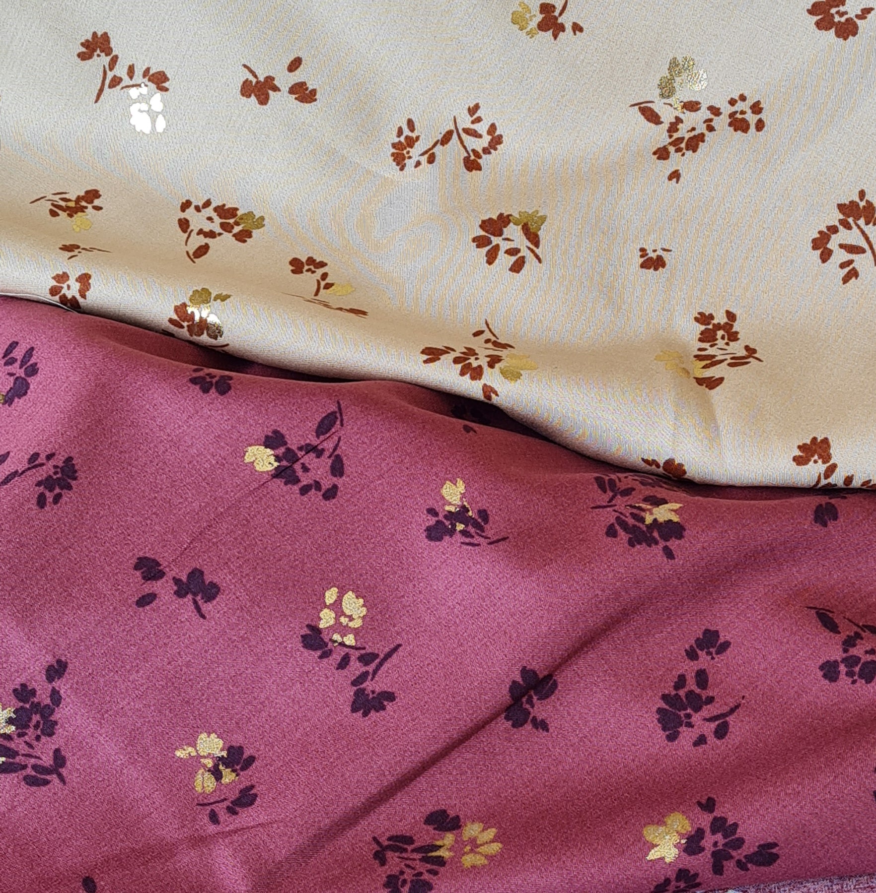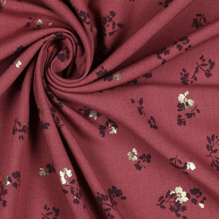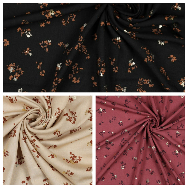 Floral 100% viscose Challis fabric, featuring a dainty floral print and metallic foil.