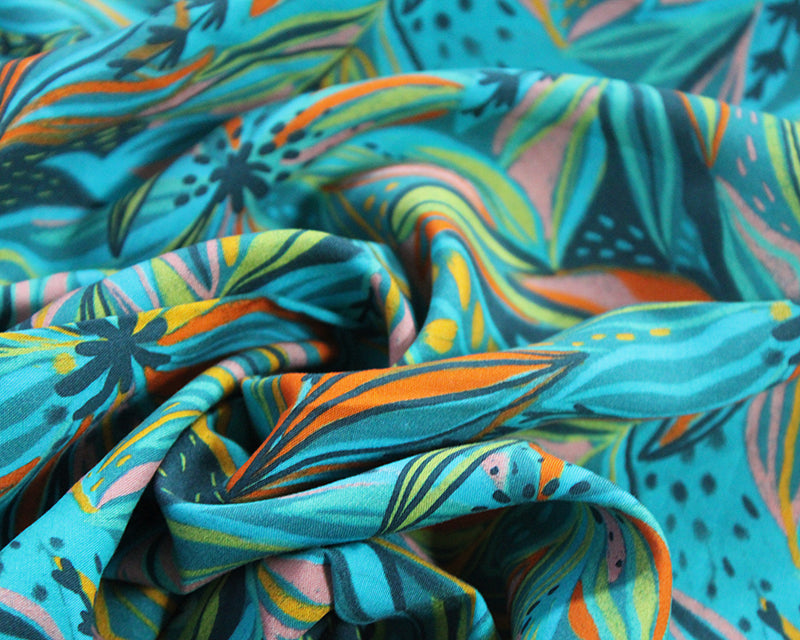 • Tropical floral 100% viscose challis in blue 140cm wide, 110gsm.