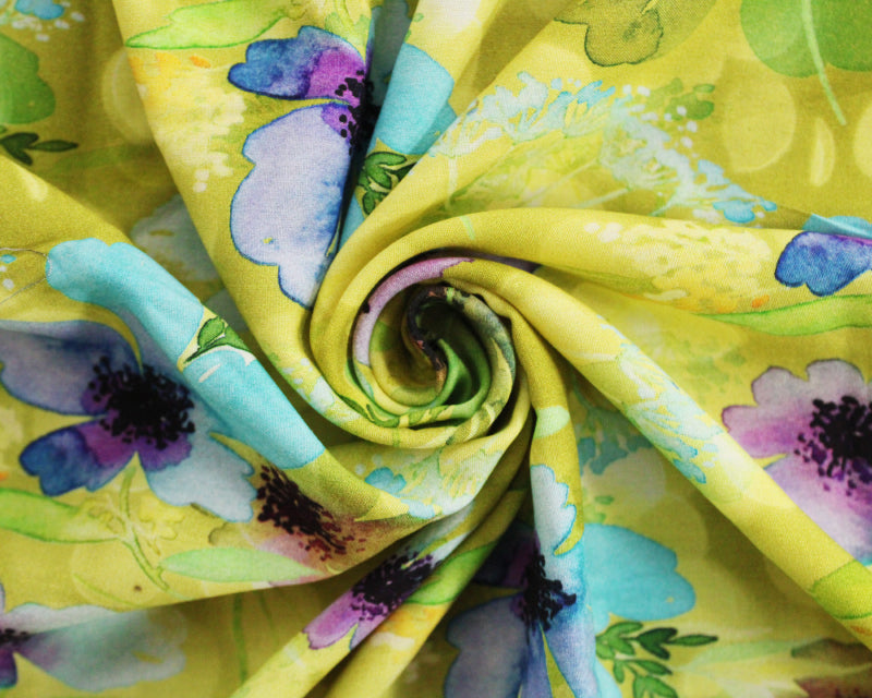 • Botanical floral 100% viscose challis in aqua 140cm wide, 110gsm.