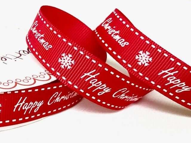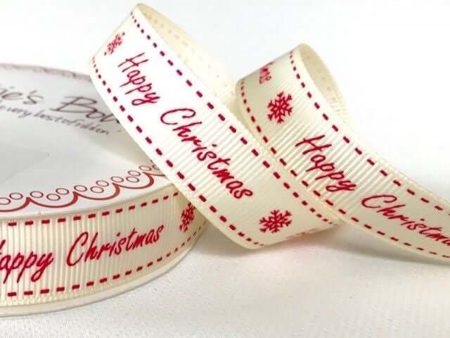 • Red happy Christmas on 16mm ivory grosgrain ribbon (3 m)