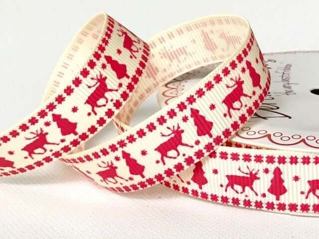 • reindeer and tree 16mm ivory grosgrain 3 m