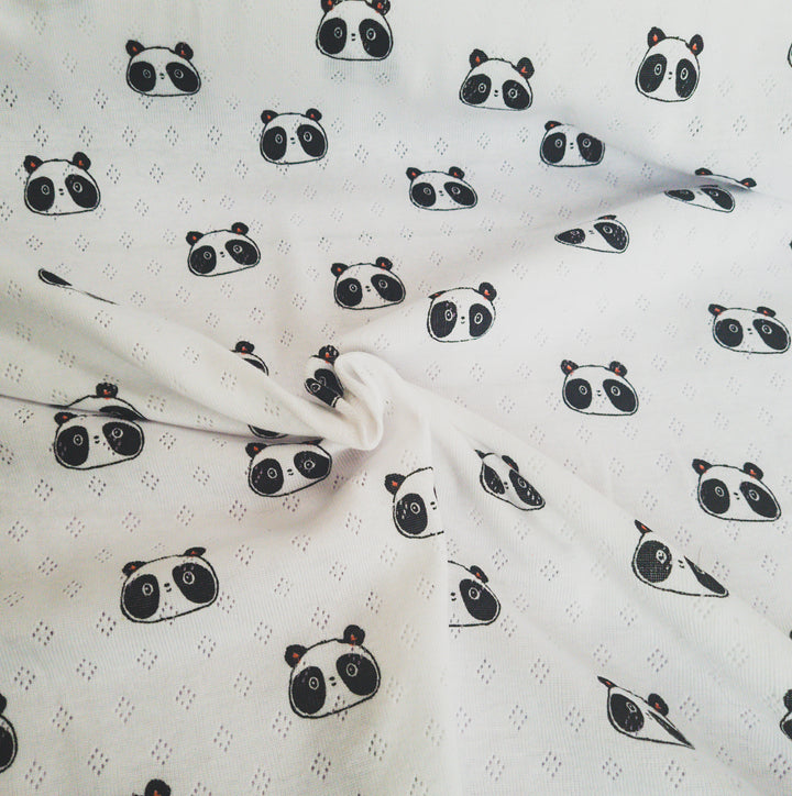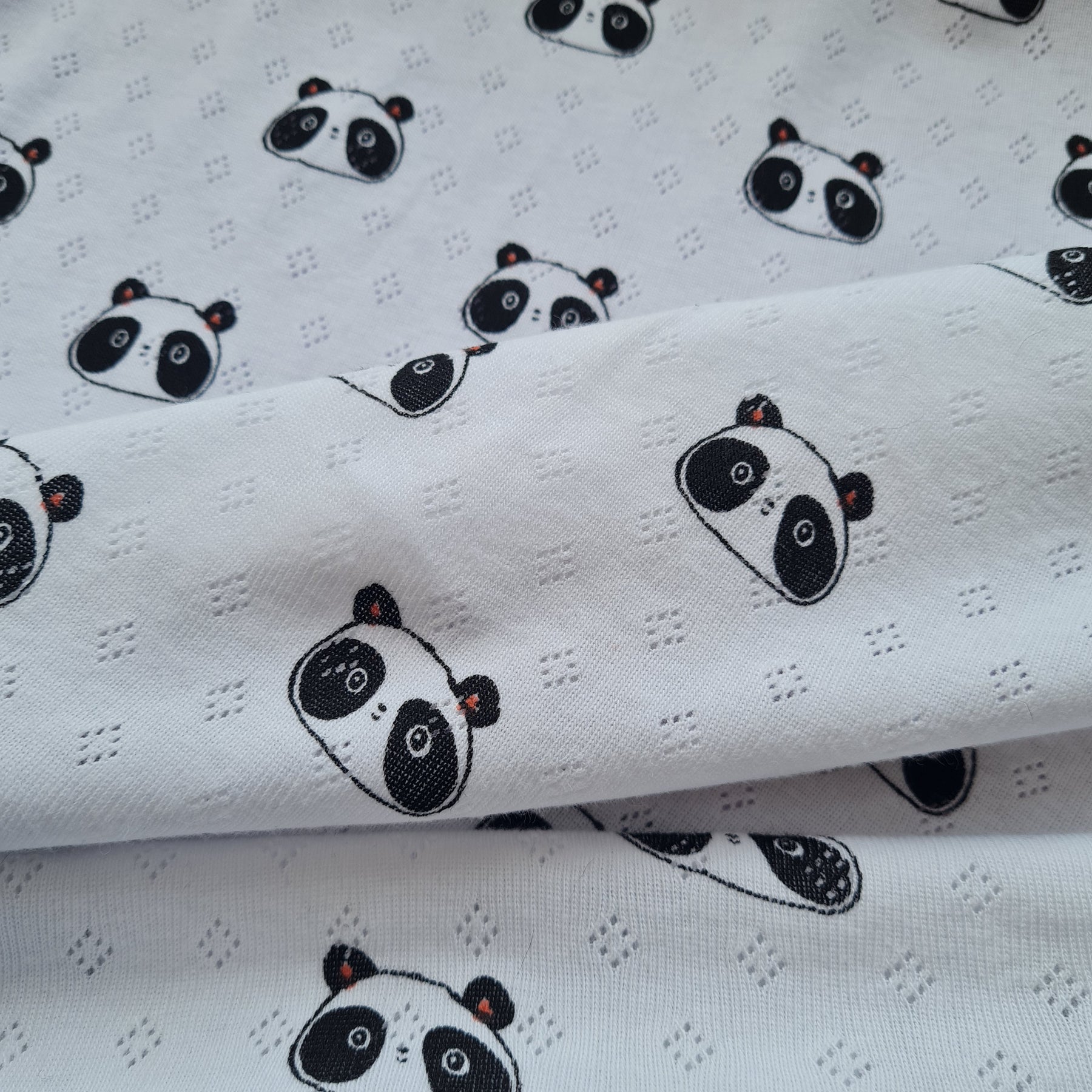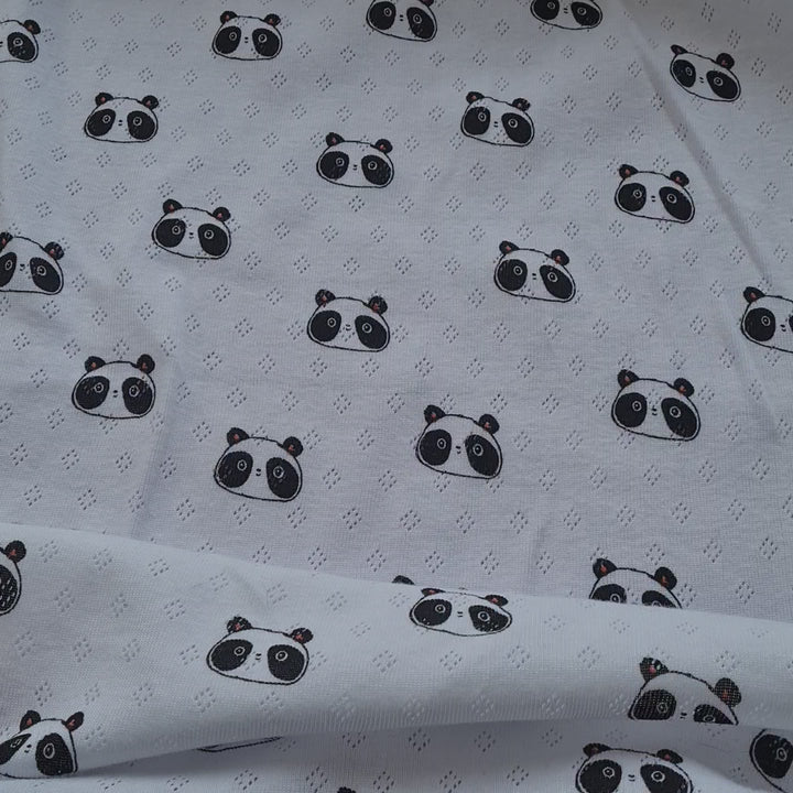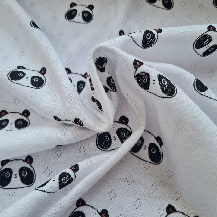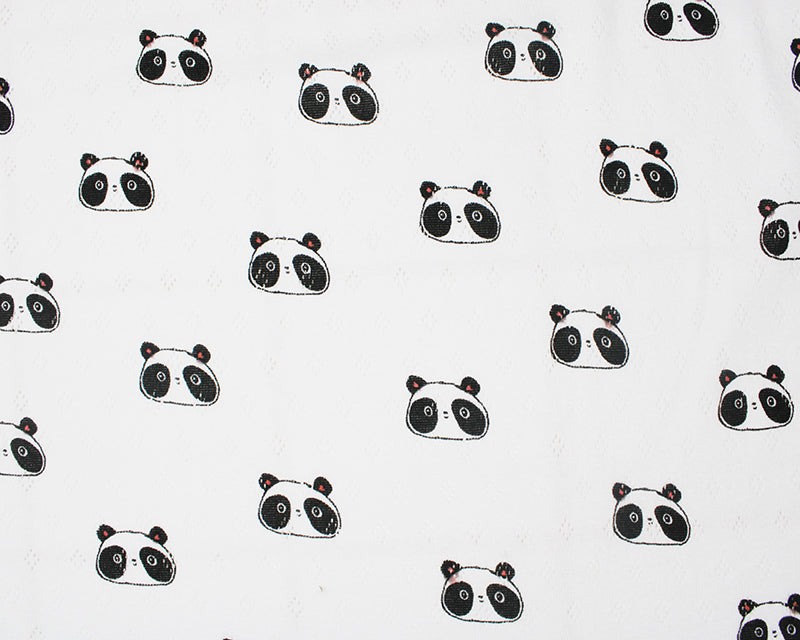 Knitted Pointelle Jersey featuring cute pandas on a white background