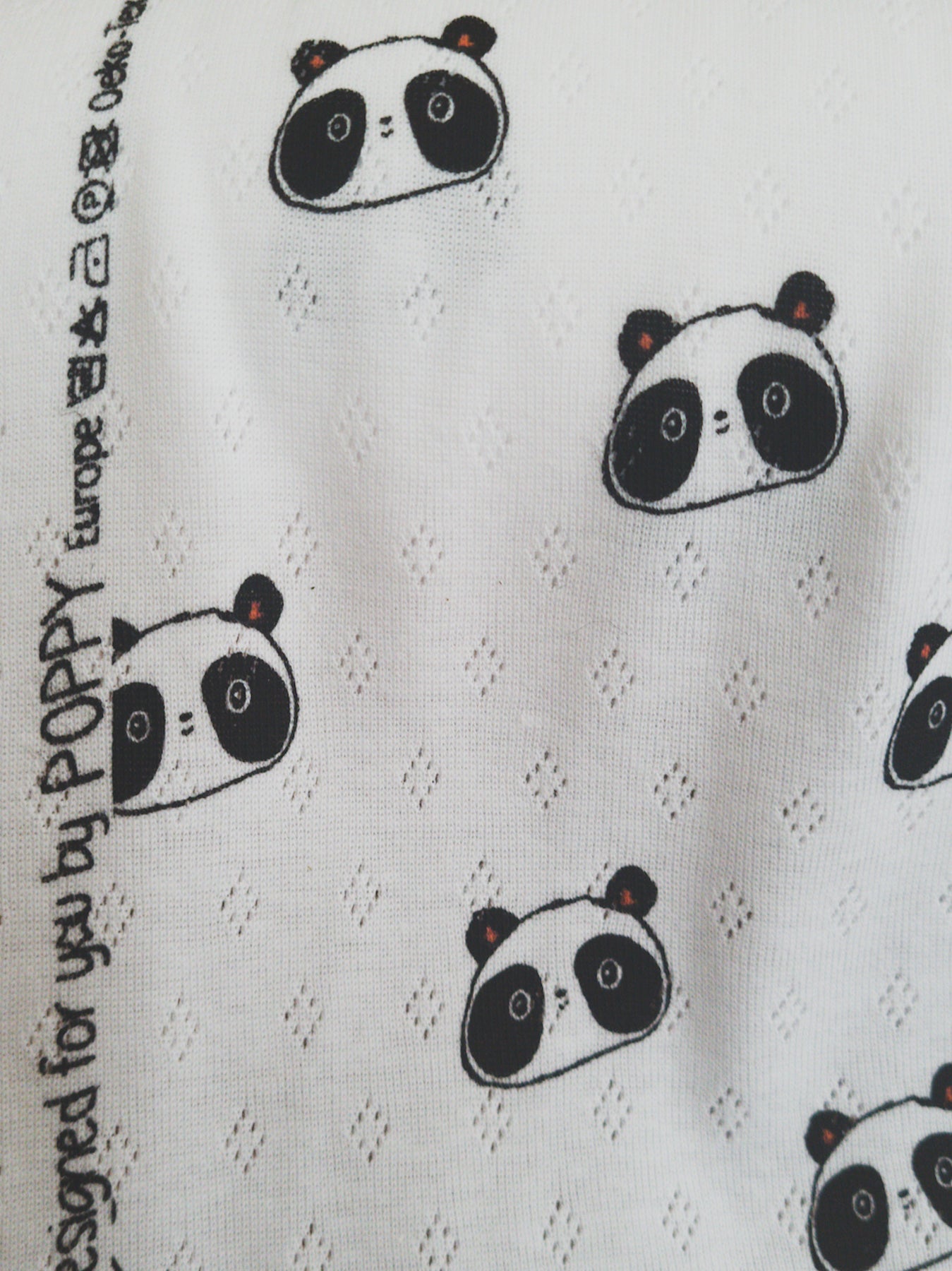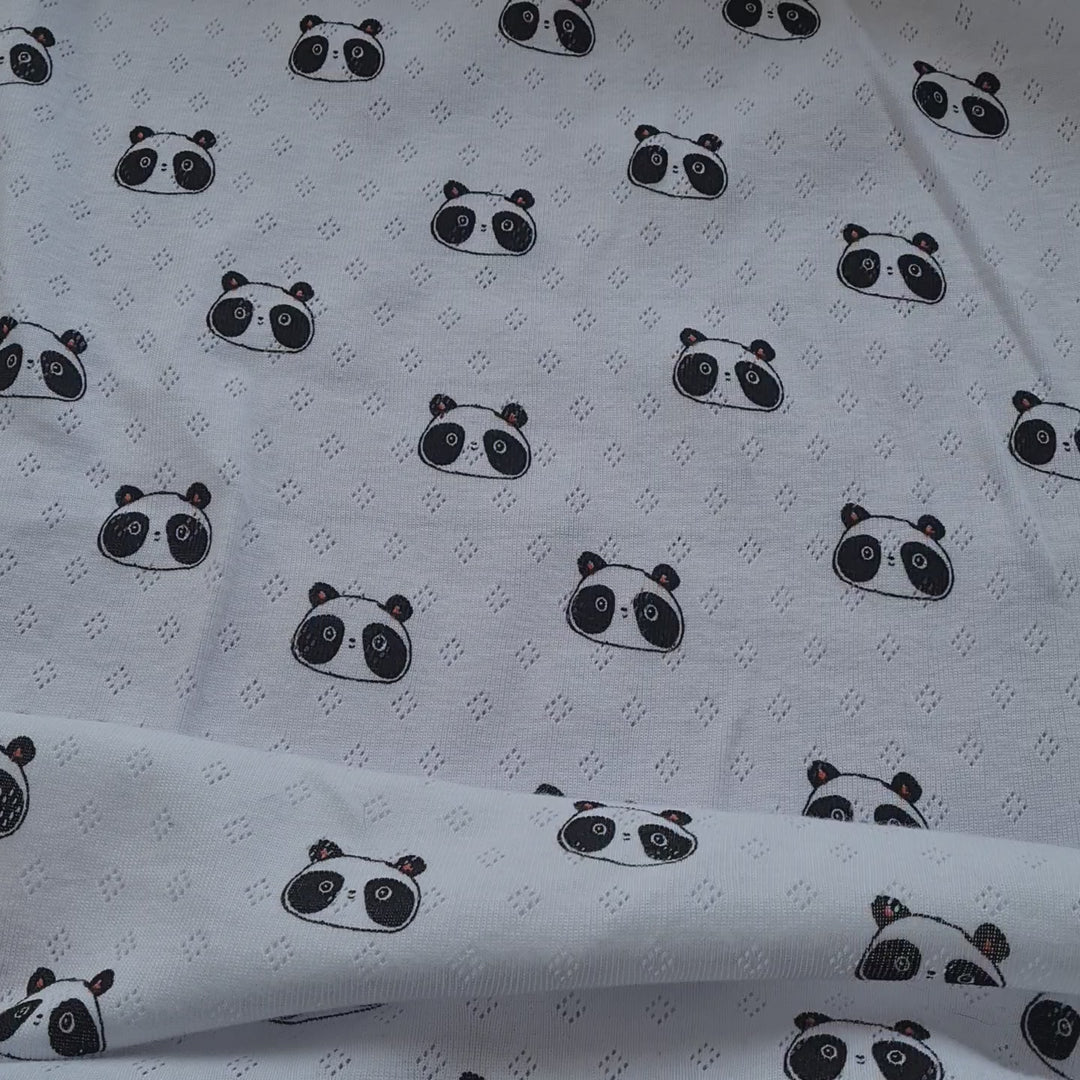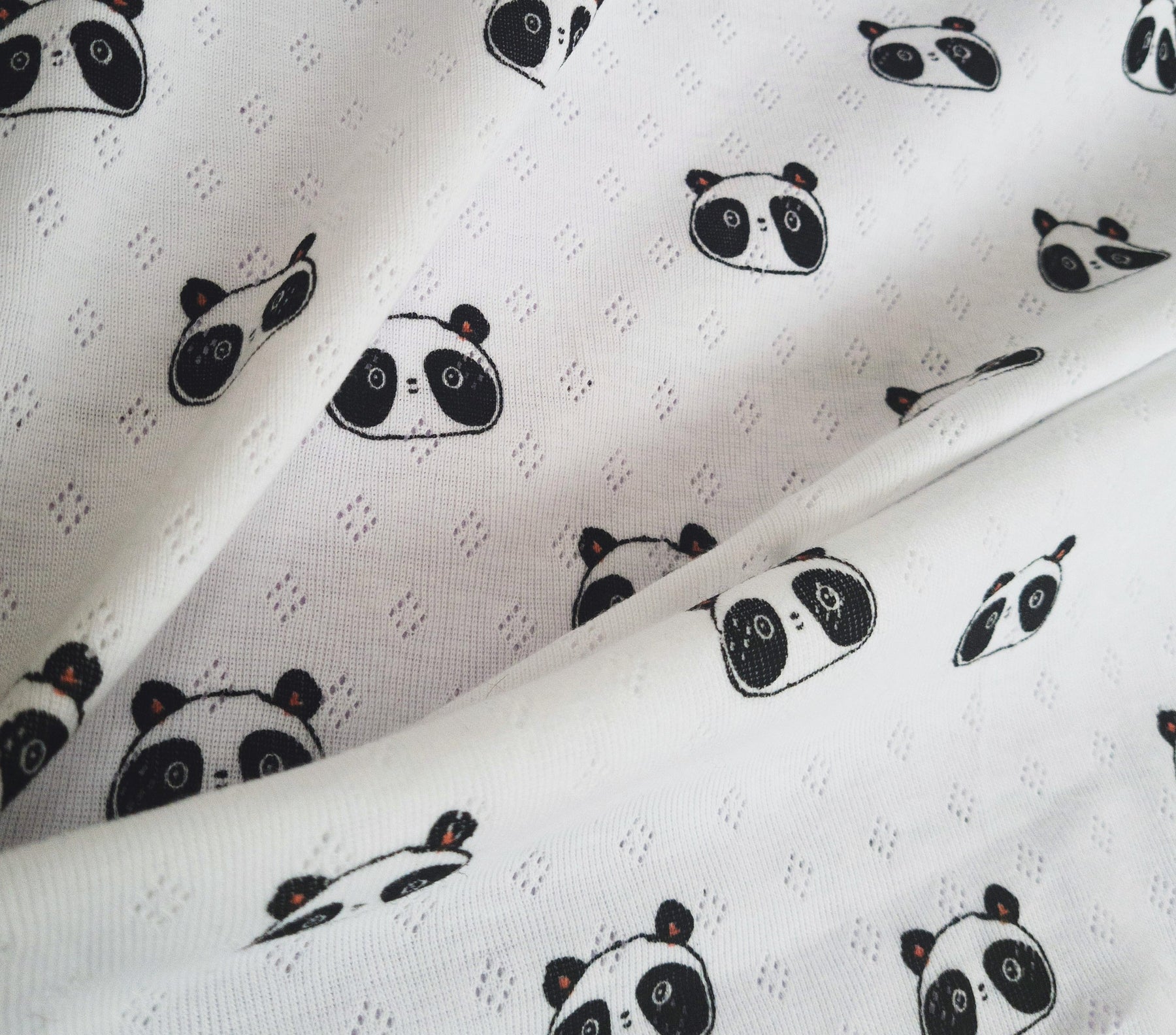 Knitted Pointelle Jersey featuring cute pandas on a white background