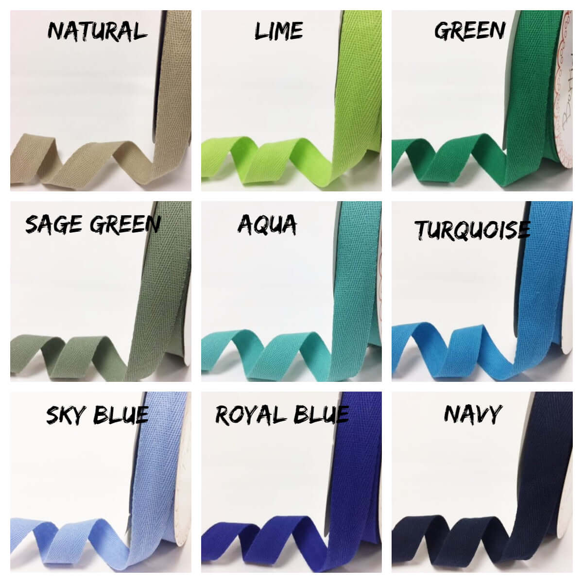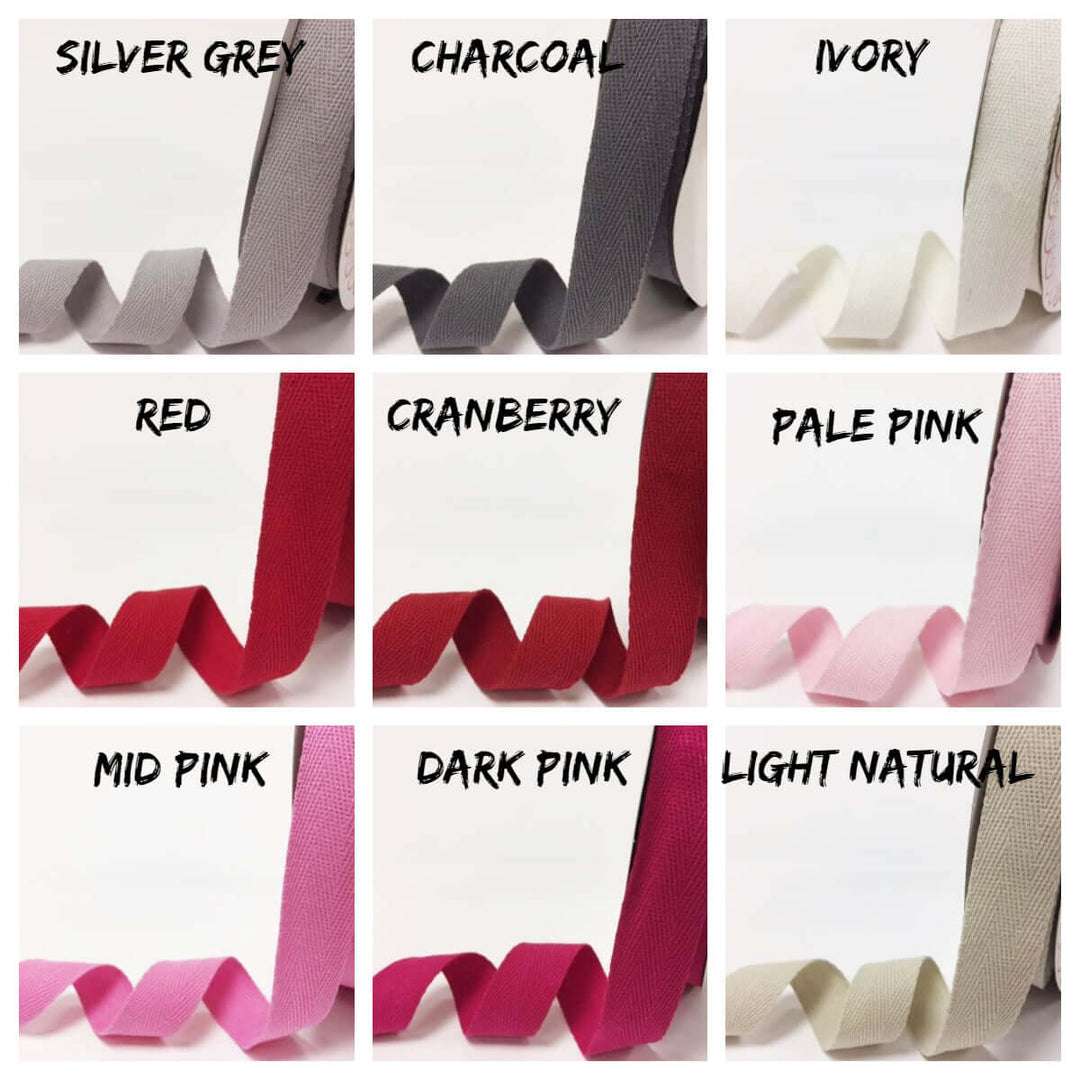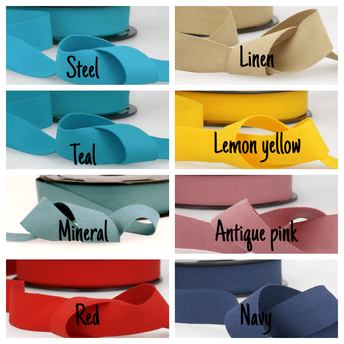 This Cotton herringbone webbing is in a beautiful array of solid/plain colours.