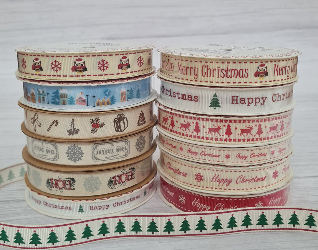 Christmas ribbon by Bertie's Bows. 9-16mm wide 3m/5m - scandi, robins, trees