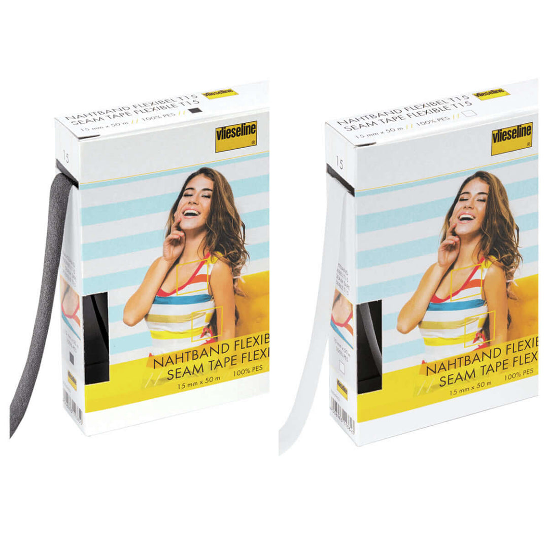 Vlieseline Vilene Fusible bi-elastic, bias-cut woven seam tape. 2VST-15 / T15: white and black/charcoal