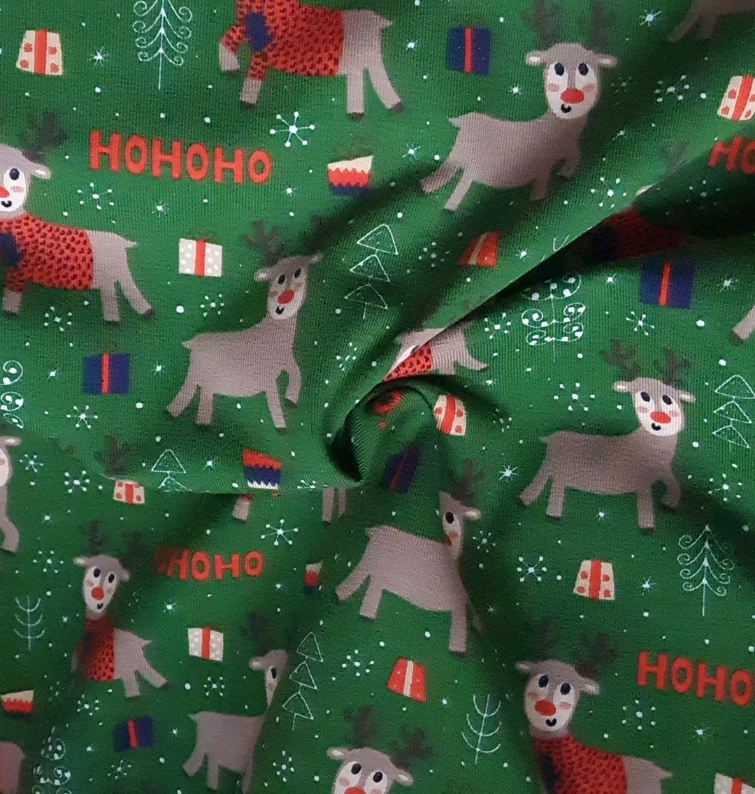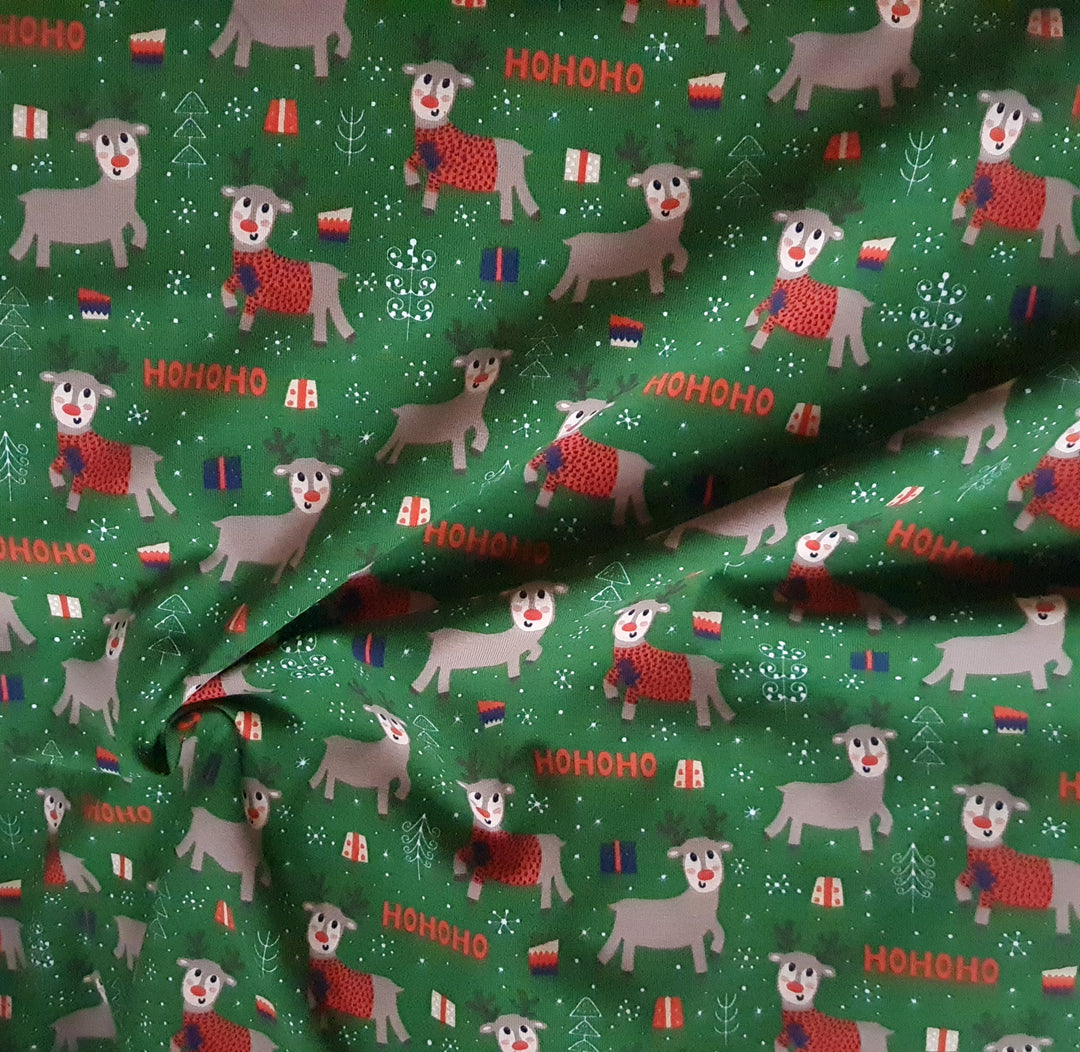Green Ho Ho Ho Reindeer Christmas cotton jersey knit T-shirt, Oeko-tex fabric. By the half metre.