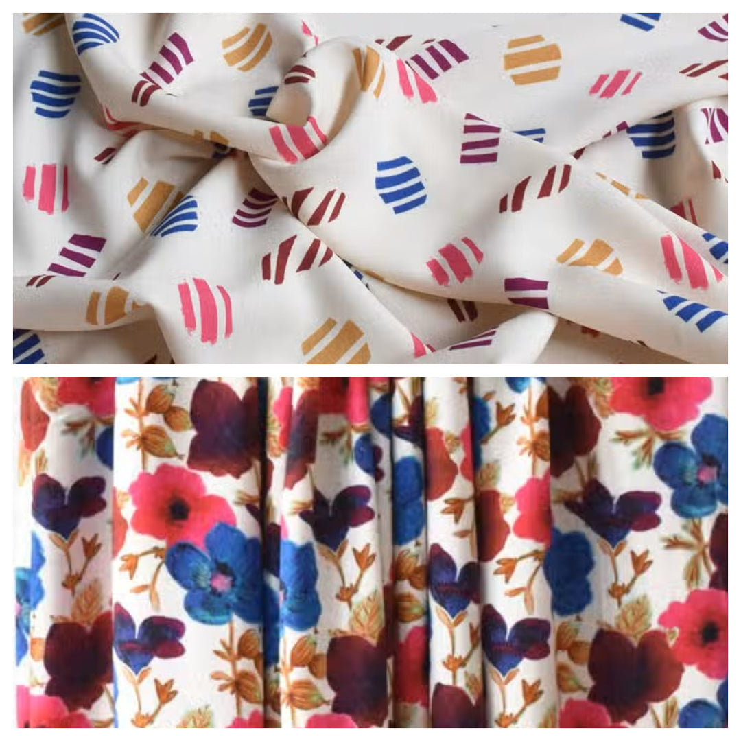 All prints are 100% Oeko-tex certified viscose challis. Fabric that is easy to sew but nevertheless retains the flexibility of viscose.