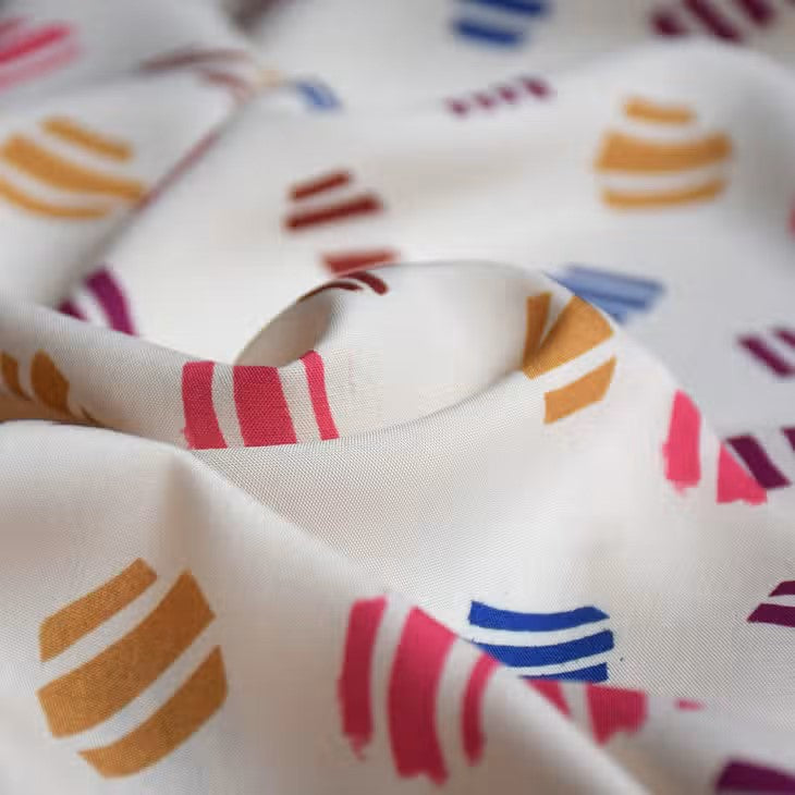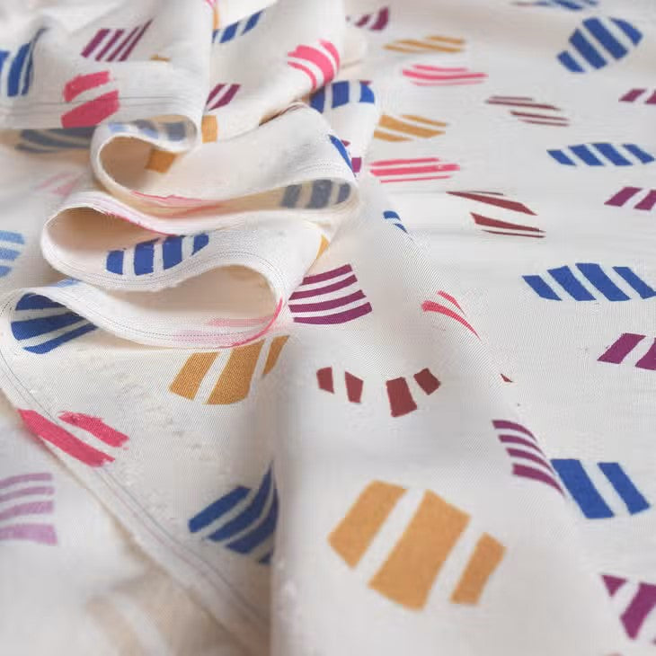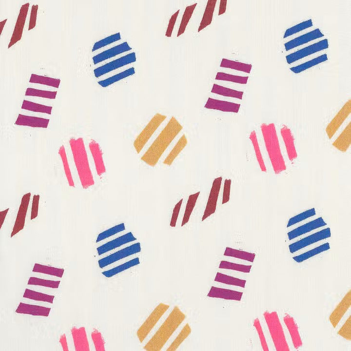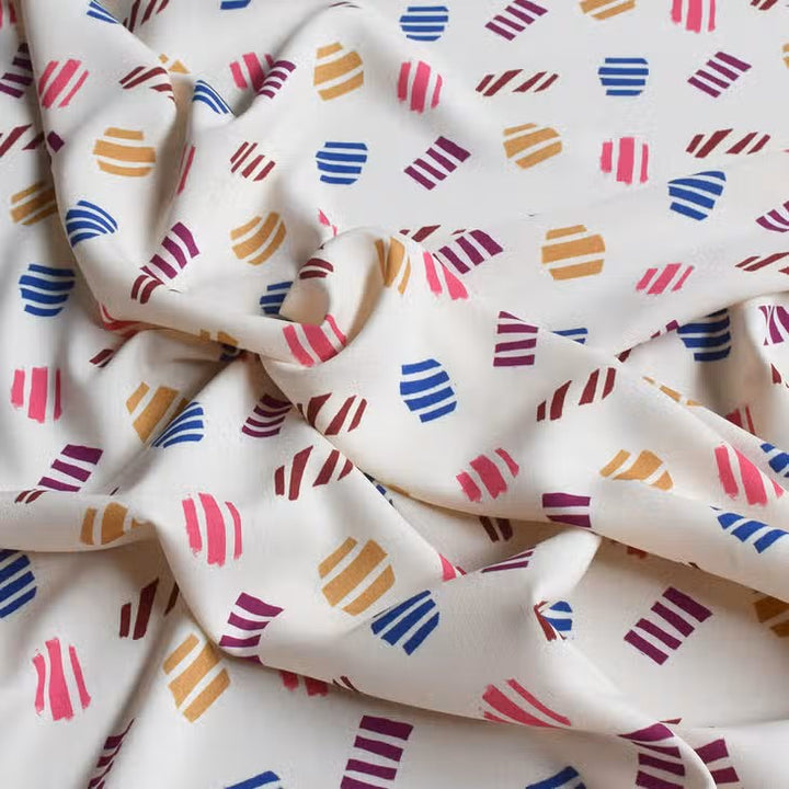 • Viscose Big Confetti Viscose on a cream background sprinkled with large multi-colored confetti as if printed with stamps. “