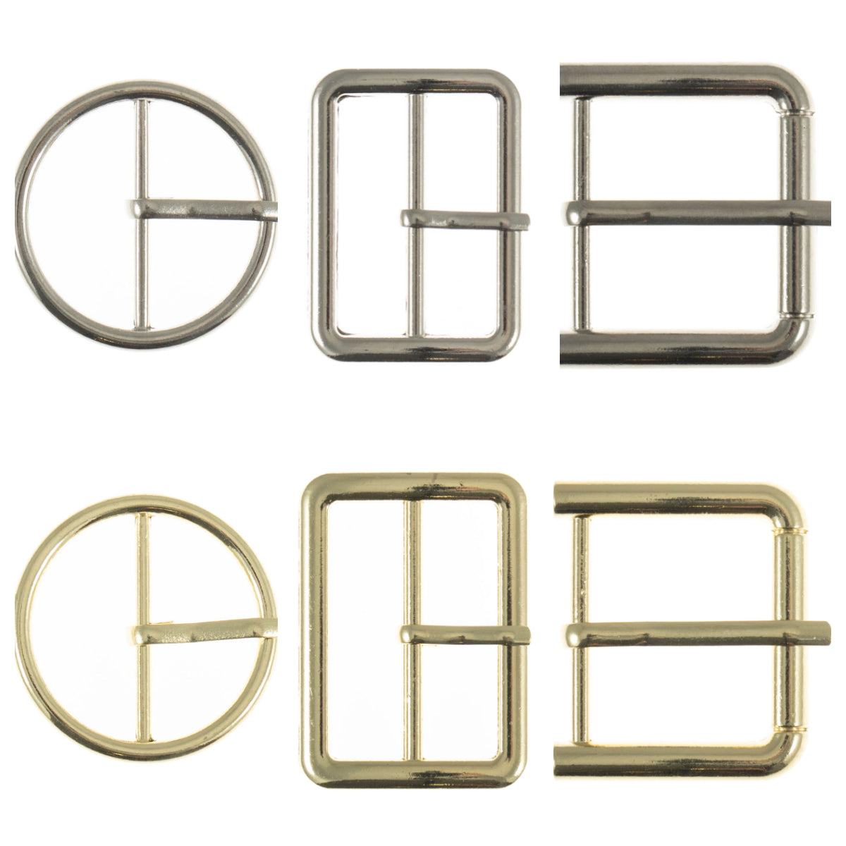 Rounded prong, and round/ circular and prong roller rectangle buckles.