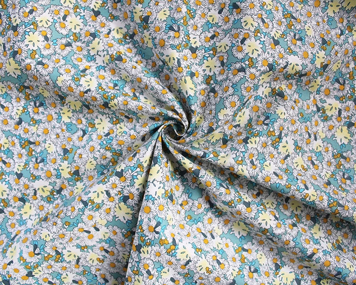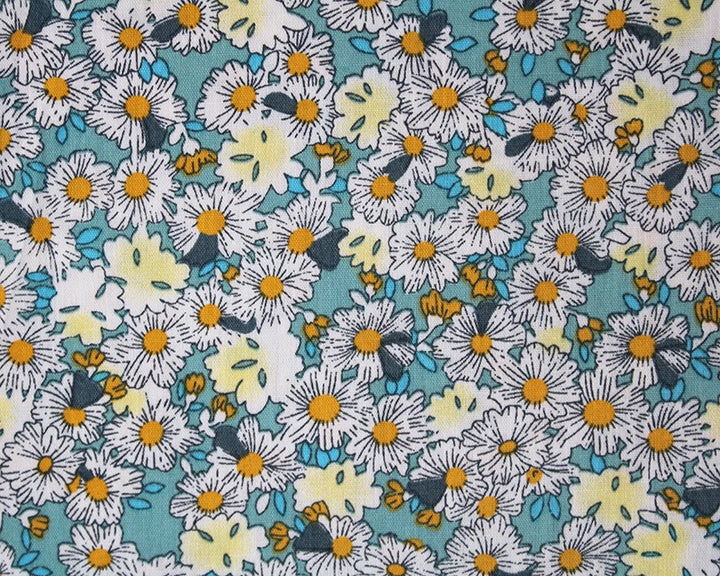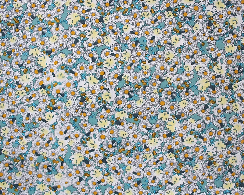This dainty floral poplin fabric features daisies with duck egg, white, blue and yellow colouring.