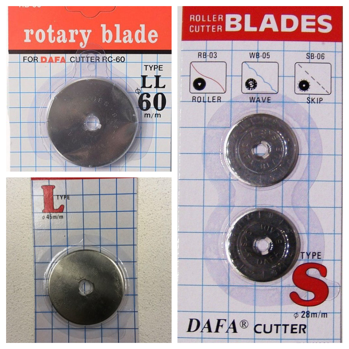 Rotary Cutter Blades: DAFA. 28 mm (x 2) 45 mm (x1). Roller Cutter blades L-type, straight cut.