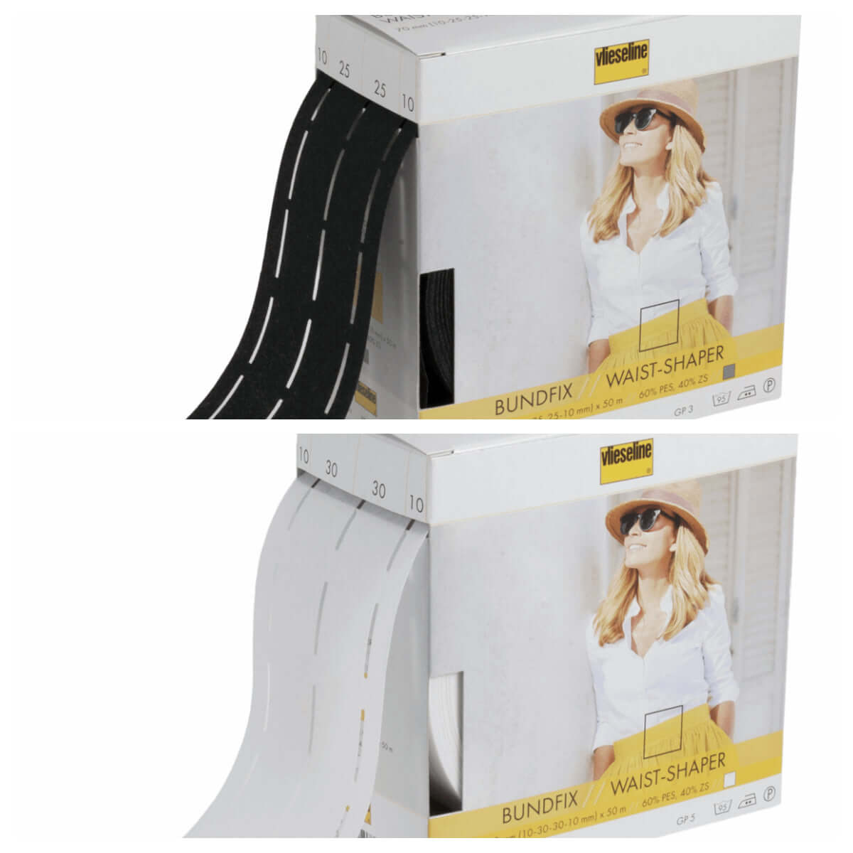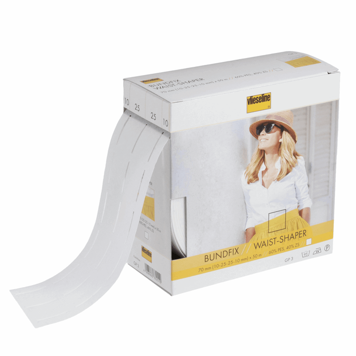 Vlieseline/Vilene Bundfix Waist-Shaper fuse and fold tape for accurate skirt and trouser waistbands, no marking required. Perforated lines ensure easy sewing and turning in.