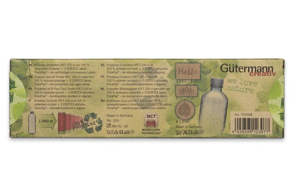 All-purpose Sew-all Thread rPET made from 100 % recycled polyester for beautiful and strong seams. FloraPap® ‒ the sustainable and vegan labels.