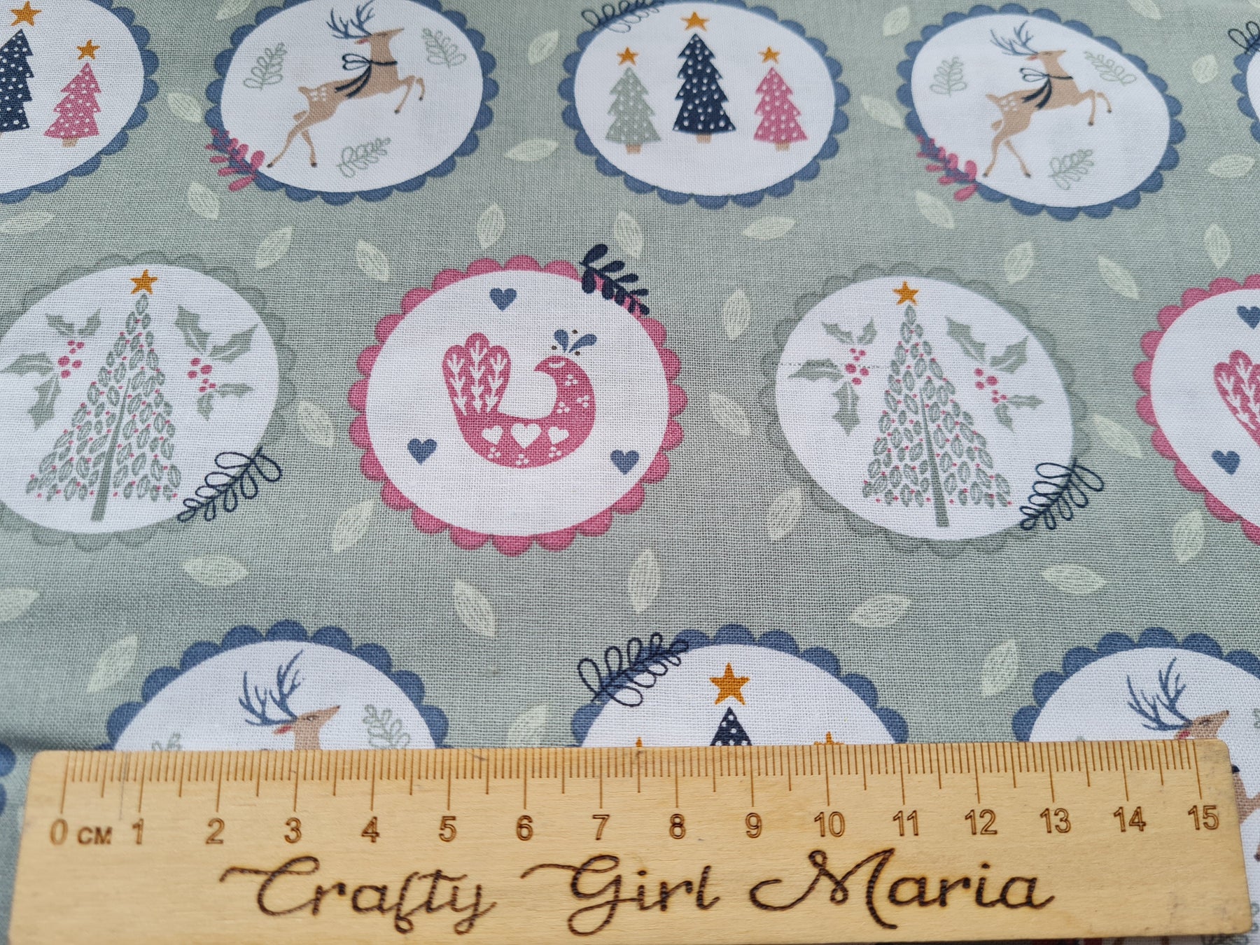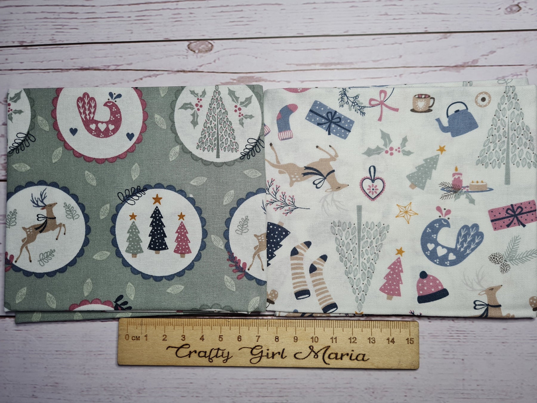 They feature Christmas trees, doves, reindeer, Holly, woolly hats and socks in beautiful sage green, grey, forest green and deep pink.