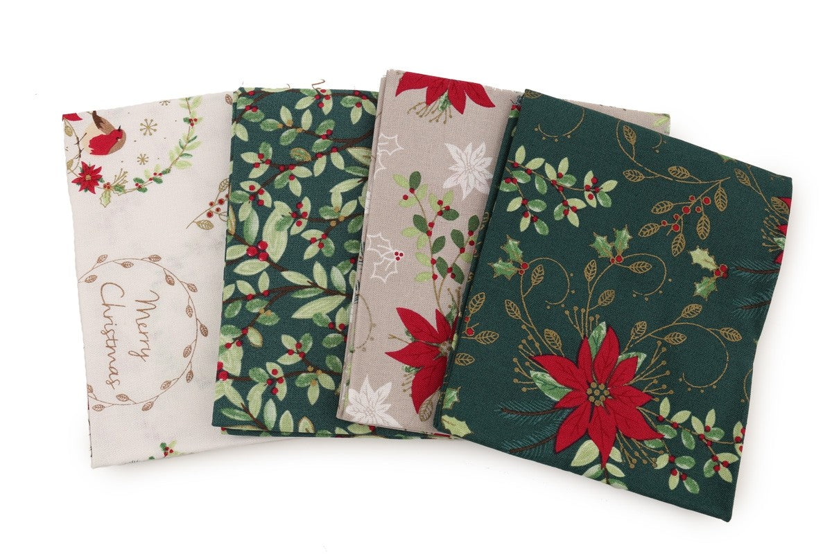 Traditional Poinsettia Christmas cotton fat quarter bundle of 4 quilting fabrics.